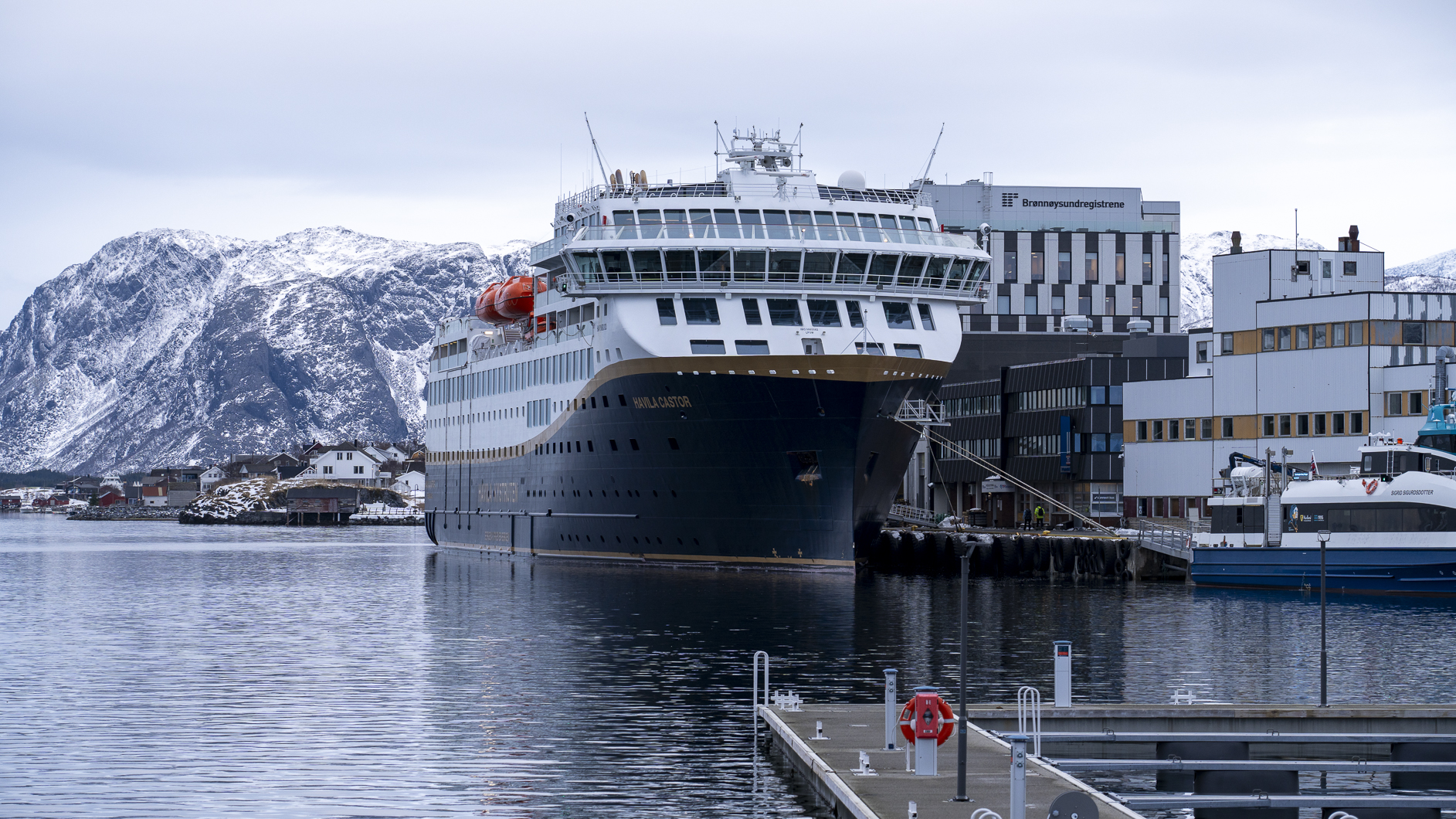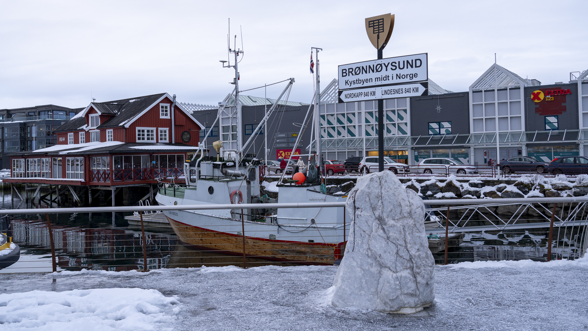 Brønnøysund liegt genau in der Mitte von Norwegen. Wir nutzten den Halt und spazieren am Hafen entlang bis zur Tafel die die Mitte markiert.
