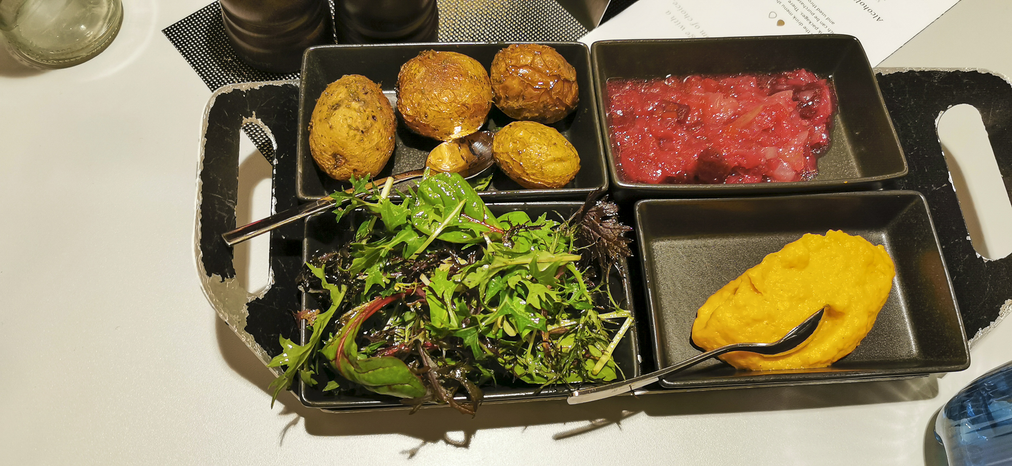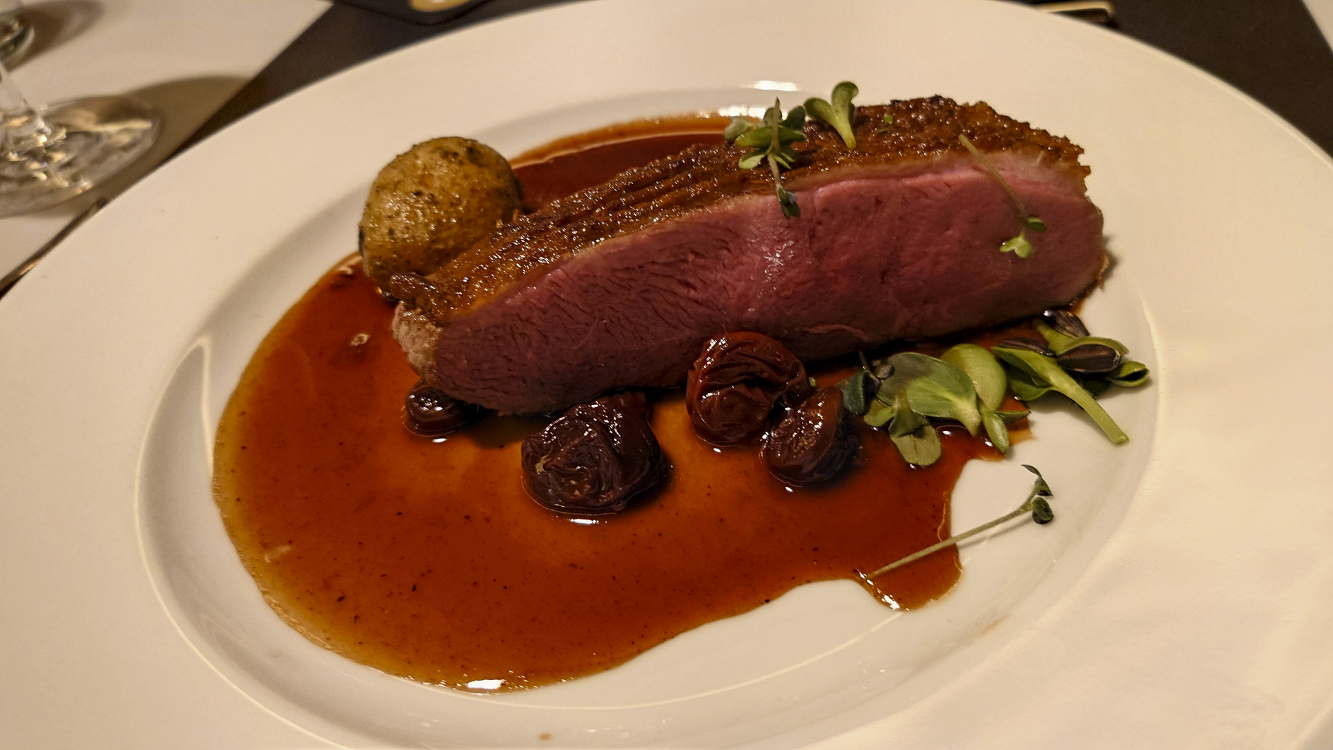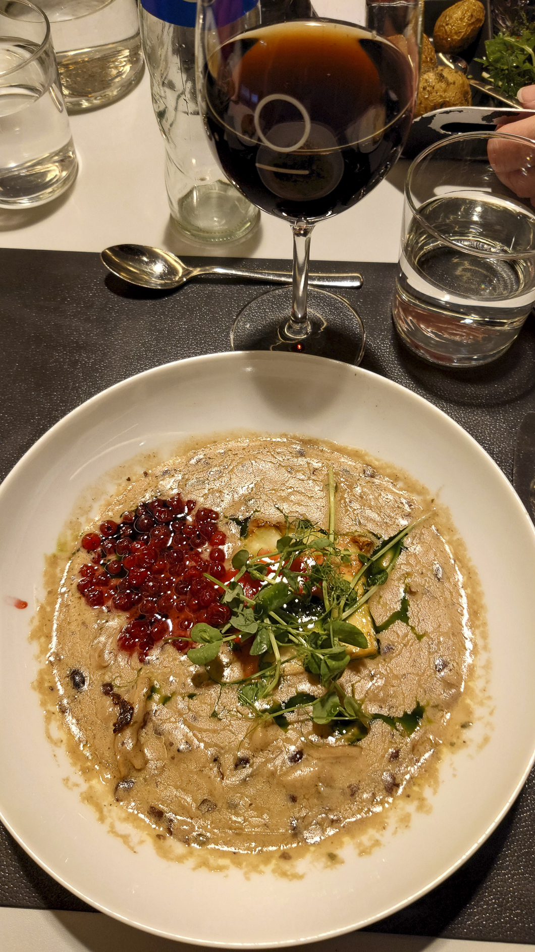 Heute lassen wir unsere Seele baumeln, geniessen das gute Essen und lassen die wunderbare Landschaft an uns vorüberziehen. Auf den Schiffen von Havila Voyages gibt es keine Buffets. Sämtliche Speisen und Getränke werden serviert. Havila hat das Ziel mit diesem Konzepte den Food waste auf maximal 75 g. pro Person und Tag zu begrenzen. Aus den Speisekarten für das Frühstück, Mittag- und Abendessen wird eine Auswahl gewählt die dann an den Tisch gebracht wird. Die Auswahl ändert sich je nach Küstenregion. Somit gibt es viel Abwechslung. Frischer Fisch ist immer vorhanden und schmeckt grossartig. Heute wähle ich jedoch das vegetarische Rinderfilet. Einfach weil ich wissen will wie das aussieht.