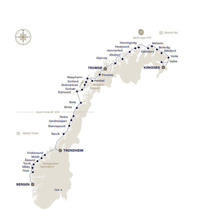 Die Schiffsrute die es seit 1893 gibt beliefert auf der Küstenstrecke von Bergen nach Kirkenes 34 Häfen mit Waren und nimmt dabei auch Passagiere und Touristen mit. Es sind also keine Kreuzfahrtschiffe sondern Arbeitsschiffe. Seit 2022 sind 11 Schiffe auf der Hurtigrute unterwegs. 7 gehören der Hurtigruten AS und 4 der Havila Kystruten. Die Reise von Süden in den Norden und zurück führt über 2500 Seemeilen (4630 km) und dauert 12 Tage.