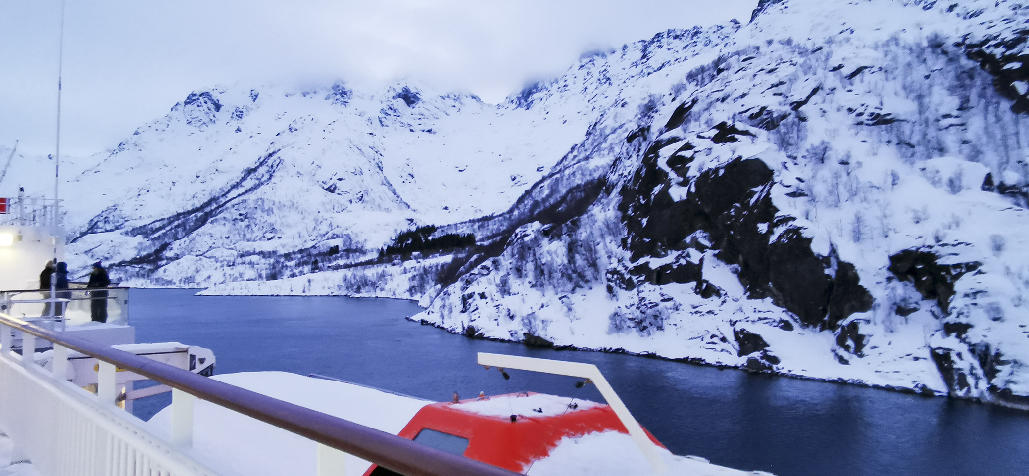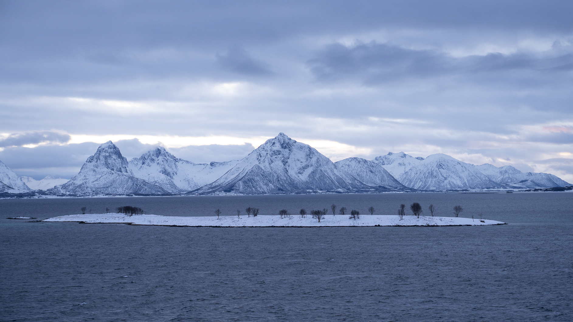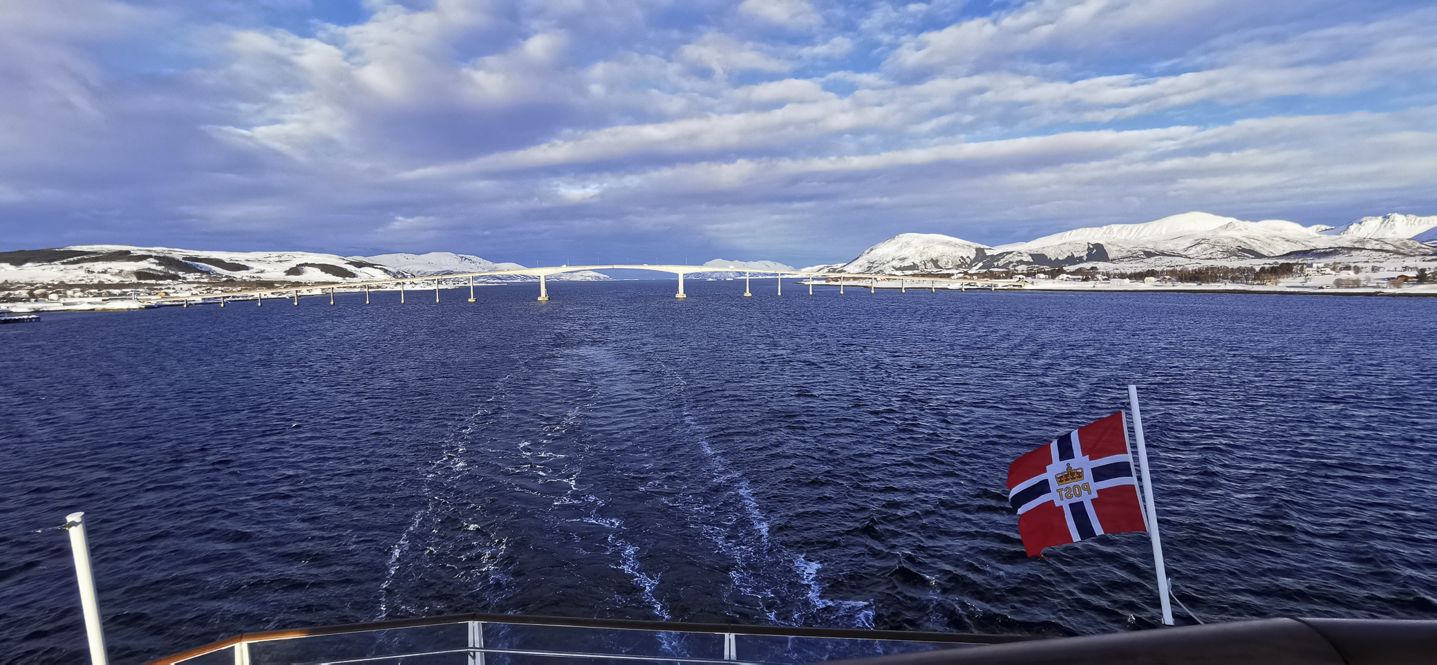 Stokmarknes ist ein Teil der Vesterålen mit seiner überwältigten Natur. Gegen Abend gleiten wir durch den Tengelfjord der an seiner schmalsten Stelle gerade mal 200 m misst. Eigentlich ist es kein richtiger Fjord, weil ein Fjord an eine Seite geschlossen ist.